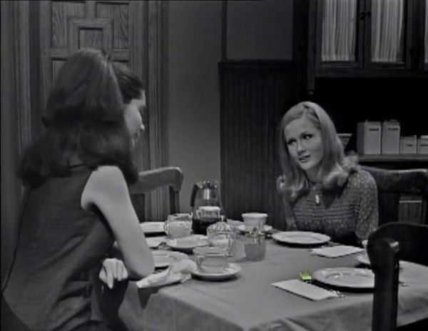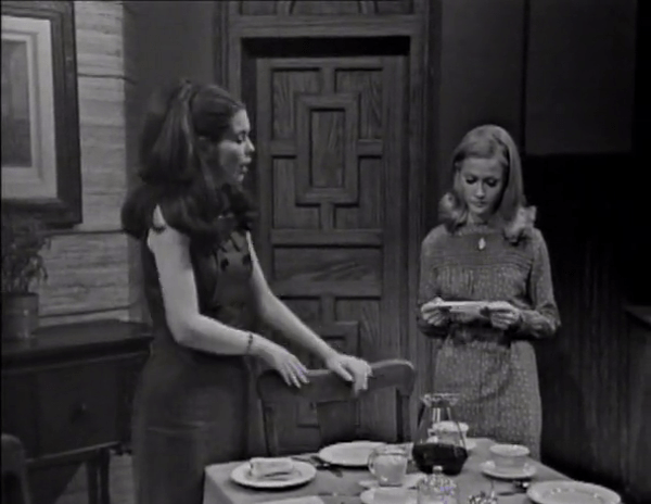 Take time to note one of my favorite set details on Dark Shadows: the elegant engraving on Vicky’s mantelpiece. It’s just an ace piece of furniture, and so unlike typical ‘nice’ soap opera set dressing.