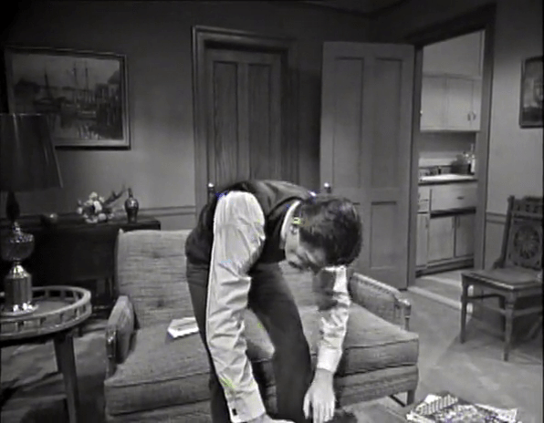 Speaking of set design, this is Burke’s room at the Collinsport Inn. Given all the money he made doing Who the Hell Knows, he’s basically renting a three room apartment. There’s a little kitchenette off to the side, there. Presumably, that door Burke is coming out of is a bedroom. This begs the question of where the bathroom is, if he truly only has three rooms?
