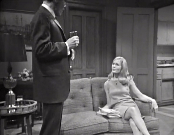 Burke sees Carolyn comfortably seated on the sofa, rather than the armchair. He offers to prepare her a drink and Carolyn, wisely for the first time, declines.