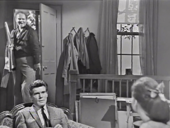 As we know, Sam finds it physically impossible to remain calm, cool and collected in any circumstance. He futzes around with his easel, wondering what it is that Burke wants. This despite the fact that in their meeting yesterday, Sam intimated that Burke could visit him another time and here Burke is, another time, visiting.