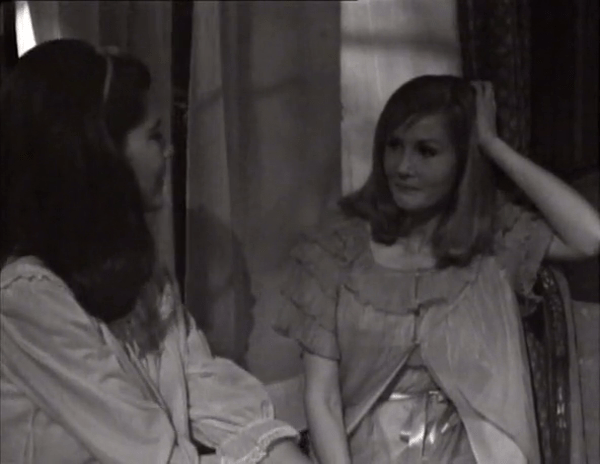 We begin with Carolyn, resplendent in her sexless poncho nightgown (seriously, her mother’s bedclothes are more sensual) dropping in on Vicky who, you may recall, has agreed to sleep with her.