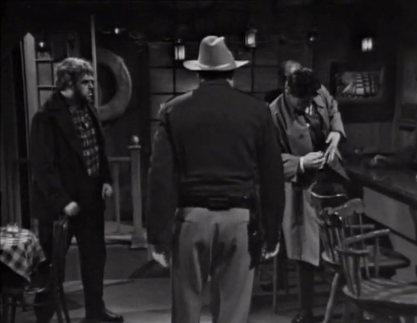 So the bartender and some pleasant looking old gentleman struggle in vain to break up the fight, but things don’t cool off until Patterson arrives in his cowboy hat and Cakes.