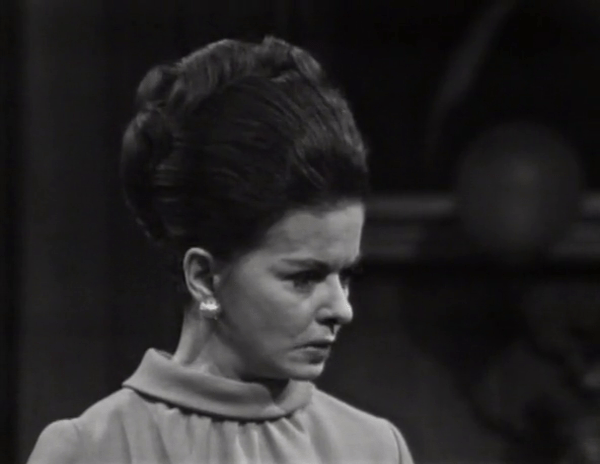 This time around, Liz is having a conversation with a “Mr. Garner”, earlier established in a phone call by Burke to the then-likewise-invisible Mr. Blair to be half of “Garner & Garner”, Elizabeth’s attorneys. This phone call allows Joan Bennett to make up for the relative draught of these scenes by giving us all the show-stoppers in one sitting: